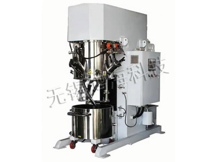 行星混合機由兩組攪拌槳和一組高速分散軸圍繞料桶軸線公轉的同時高速自轉,從而使物料受到強烈的剪切、捏合作用,達到快速混合的目的;攪拌槳有槳葉式、麻花式、爪式、框式等多種形式,針對不同粘度、比重的物料和不同的生產工藝要求可以選擇較好的攪拌形式。